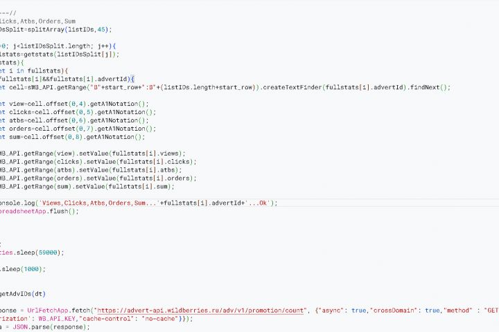 Скрипты на App Script - Подгрузка данных с рекламных кампаний Wildberries (WB API), сортировка, обработка, выборка по датам и заполнение таблицы в Google Doc.