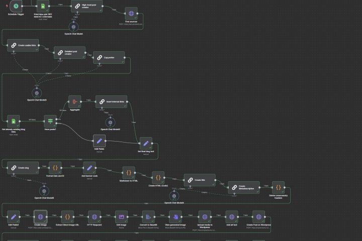 Весь процесс — от сбора ключей до публикации и аналитики — полностью автоматизирован в n8n с использованием OpenAI, Google Sheets, WordPress API и современных генераторов изображений.