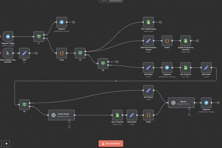 Разработал кастомный workflow на n8n с интеграцией Telegram и Google Sheets.