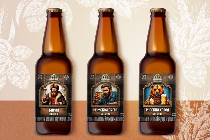 Была задача сделать линейку этикеток для пива эконом-сегмента. Этикетки должны были быть в единой суровой стилистике. Стилистика была задана названиями линейки - "Барин", "Мужской лагер", "Русский холод". Две иллюстрации заказчик сгенерировал самостоятельно и была задача продолжить линейку и вписать эти иллюстрации в дизайн.