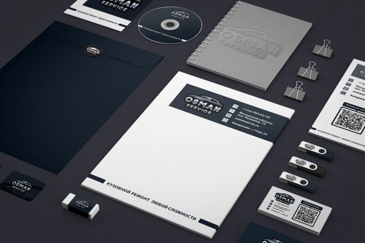 **Результат проекта:** Фирменный стиль компании "OSMAN SERVICE", который включает в себя логотип, визитные карточки, папку для документов, конверт, диск и другие печатные материалы.