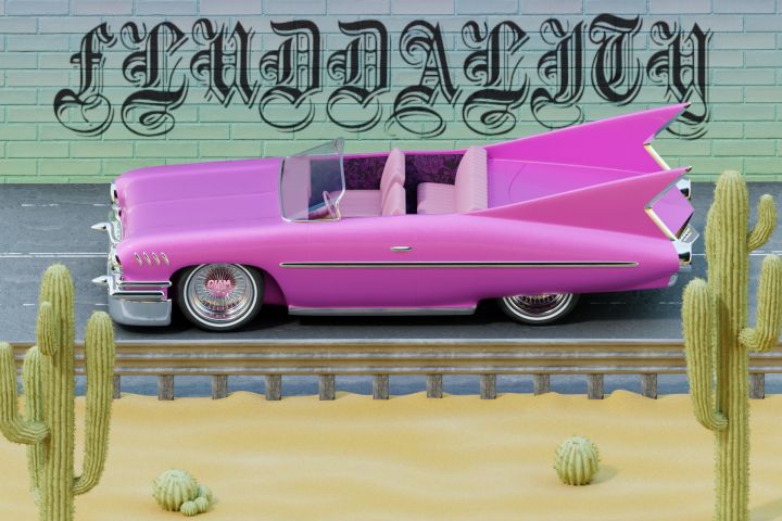 Создать обложку для трека с летним, тёплым настроением используя розовую машину