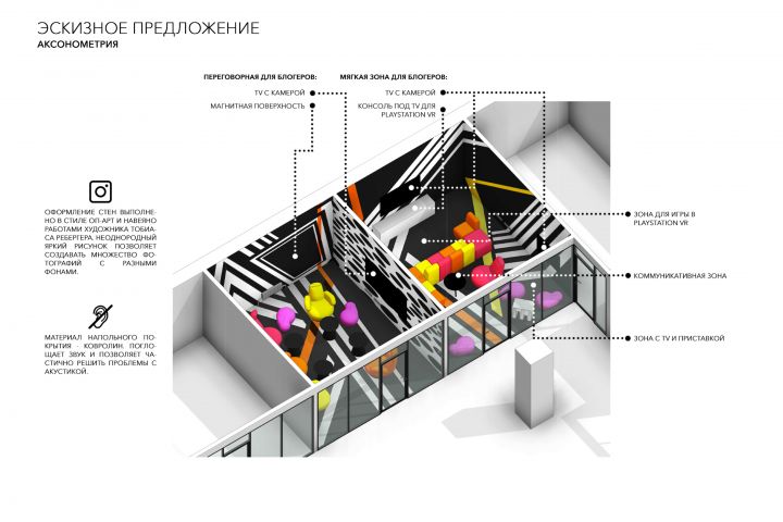 Стояла задача разработать пространство для времяпровождения блогеров в офисе креативного агентства. За основу дизайна были выбраны референсы художника Тобиаса Ребергера.