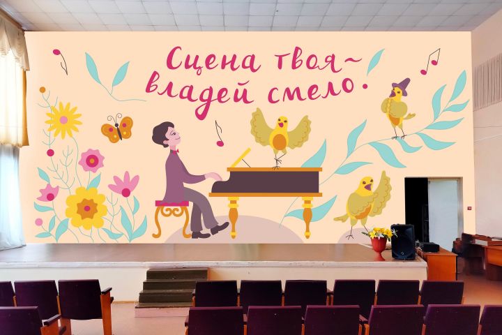 С помощью применения одинаковых элементов и цвета получилась серия иллюстраций для 3-х стен, которые будут радовать школьников в актовом зале школы.
