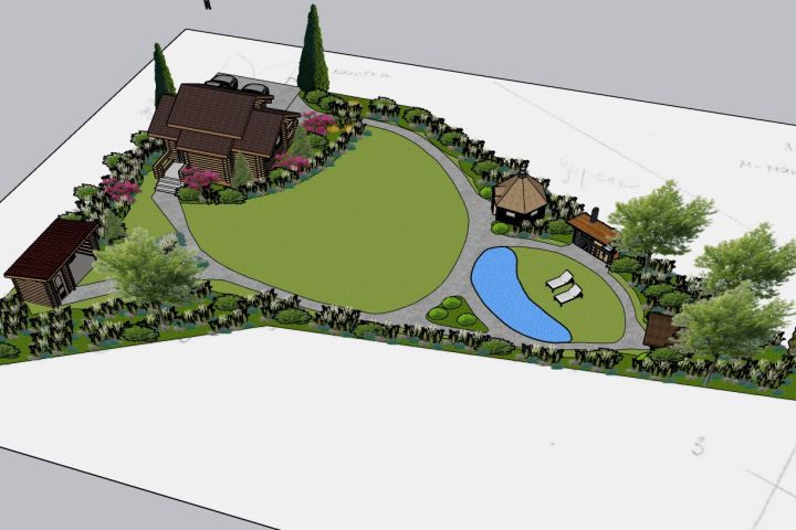 Задача: Разработать концепцию ландшафтной организации участка сложной формы с максимально эффективным использованием ограниченного пространства. Необходимо разместить: жилой дом, баню-бочку, закрытую всесезонную беседку, зону мангала, хозяйственный блок и парковку на 2 автомобиля, обеспечив логичные связи между объектами и комфорт использования.