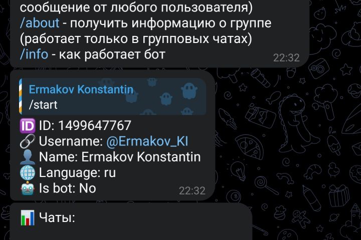 Бот показывает открытые данные о пользователях, которые взаимодействуют с ботом. Также можно пересылать боту сообщения других пользователей, каналов и групп для отображения их данных. Можно добавлять бота в группу.
