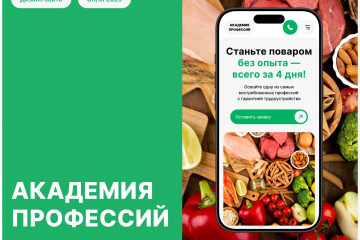 Дизайн сайта для кулинарной академии, которая в кратчайшие сроки готовит квалифицированных специалистов и обеспечивает им трудоустройство