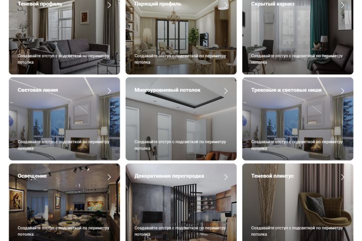Упрощение выбора — каталог с разными видами профилей: теневой, парящий, скрытый карниз, световая линия и пр.
