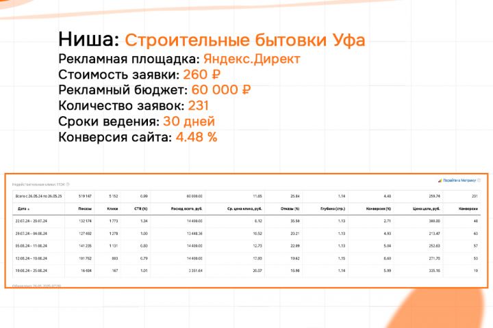КЕЙС: Бытовки Уфа - Б2С - Яндекс 231 заявка по 260 руб