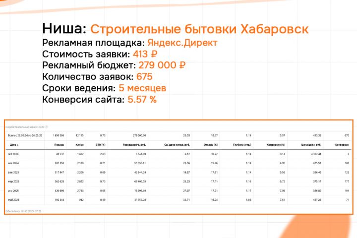 КЕЙС: Бытовки Хабаровск - Б2Б - Яндекс 675 заявок по 413 руб
