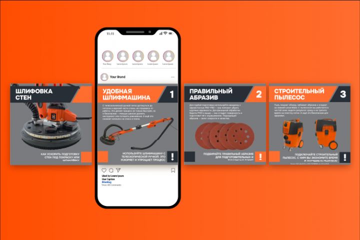 Я написал контент-план и тексты полезных и продуктовых постов для компании, занимающейся продажей строительного инструмента. Была задача создать графику в виде каруселей и в фирменном стиле.
