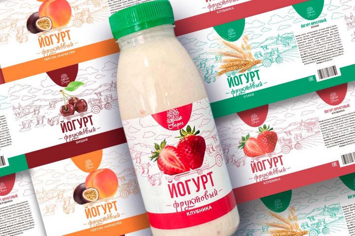 Разработка иллюстраций и верстка упаковки для йогурта. Фрукты на упаковке - реалистичные иллюстрации.