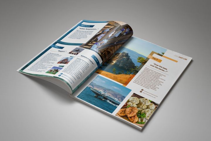Особое внимание уделил читаемости текста и логике подачи информации: журнал легко листается, а каждый разворот вдохновляет читателя спланировать поездку с «East Line». Итоговый макет полностью готов к печати и помогает агентству привлекать клиентов, показывая Байкал с самой красивой стороны