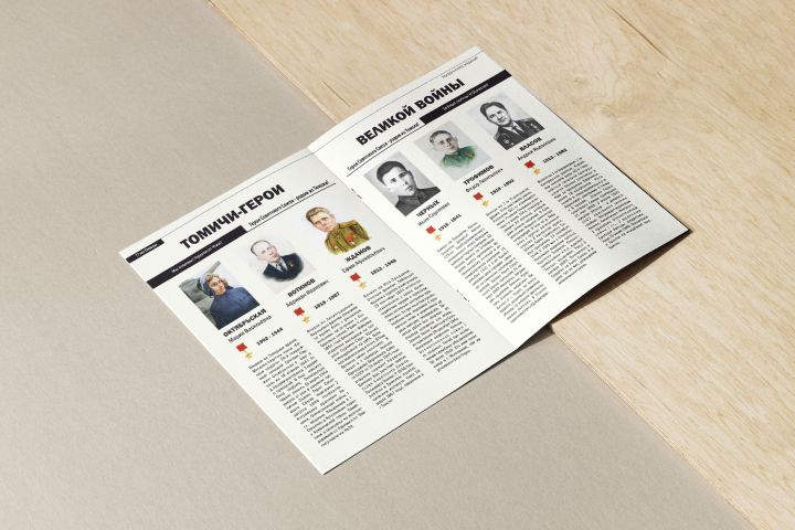 Дизайн полностью выполнен в CorelDraw с учётом печатных требований: правильные отступы, чёткая верстка и баланс цветов. В итоге получилась информативная и выразительная листовка, которая достойно рассказывает о подвигах томичей и подходит для использования на выставках или памятных мероприятиях