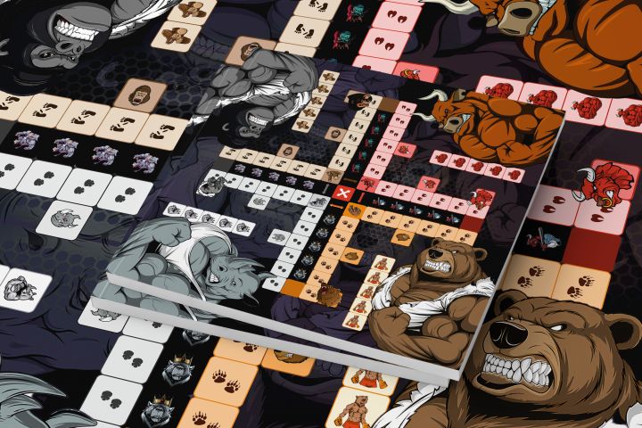 Для настольной игры LUDO я создал оригинальный дизайн в двух тематических вариациях. Первая версия — со зверями-качками — была выполнена как в печатном виде, так и вручную, специально в подарок на день рождения. К сожалению, фото печатного варианта не сохранилось, но он был выполнен в том же стиле и напечатан на качественной самоклеящейся бумаге.