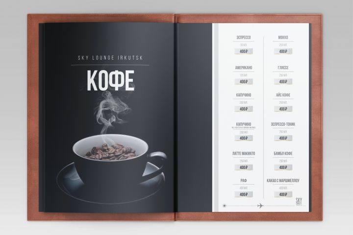 Для караоке-бара «Sky Lounge Irkutsk» я сделал стильную карту бара — продумал структуру, подобрал шрифты и цвета под атмосферу, грамотно разложил блоки с коктейлями и крепким, обработал фото, всё сверстал в CorelDraw и подготовил файл под печать. Заказчик остался доволен