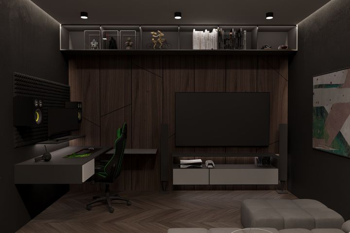В рамках проекта "Дизайн визуализация рабочего кабинета", была поставлена задача создать уютное и функциональное пространство в благородных оттенках. Клиент желал воплотить в жизнь стильный и современный интерьер, где основным акцентом станет эргономичное рабочее место и зона для отдыха.