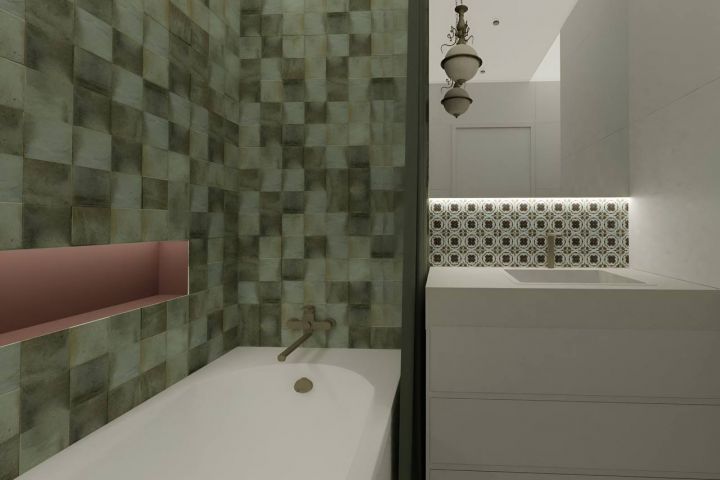 Была выбрана классическая форма сантехники, сочетание нейтральной плитки и акцентной стены с узором или текстурой, отсылающей к ретро-мотивам. Современные материалы и освещение обеспечили комфорт и долговечность.