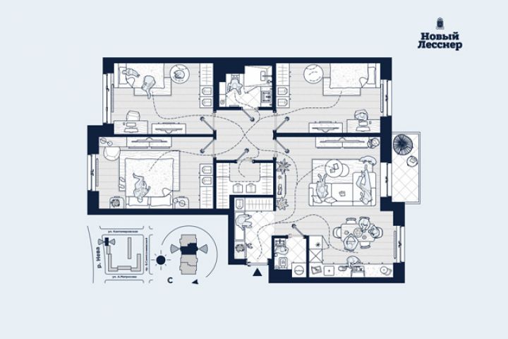 Вариант с высокой детализацией планов квартир для застройщика ОТДЕЛСТРОЙ на примере квартиры в ЖК "Новый Ленсснер"