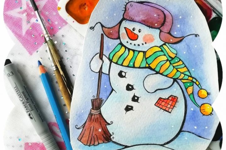 Снеговики отрисованы от руки акварелью, линерами, в смешанной технике.