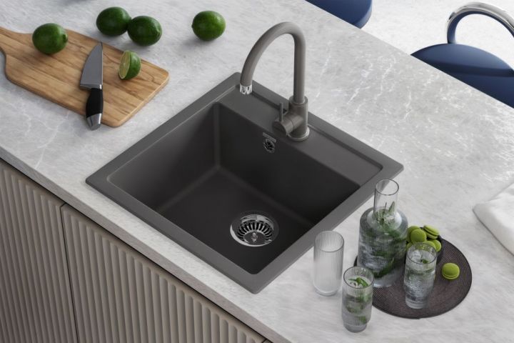 Вписать мойку и смеситель в интерьер кухни с островом, чтобы они выглядели органично и эстетично. Основной акцент — на интеграцию сантехники в современную композицию.