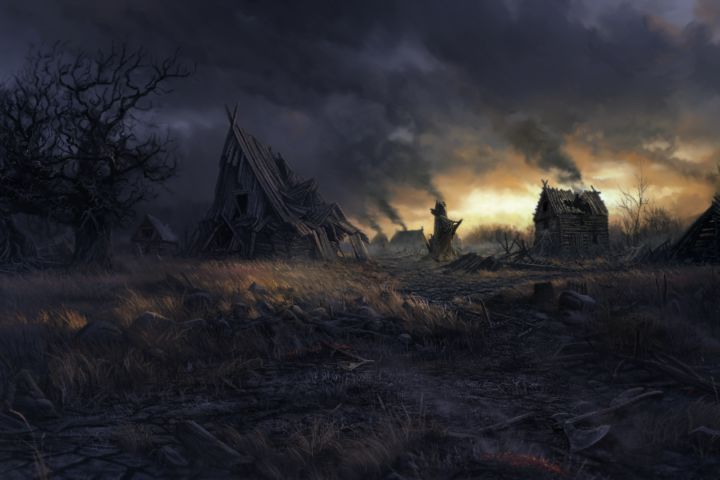 Цель: создать мощную и тревожную иллюстрацию разрушенной деревни, передающую атмосферу трагедии, запустения и опасности, характерную для мрачного фэнтези.