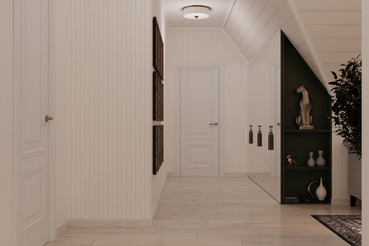 На фотографии представлен холл второго этажа с мансардной крышей. Несмотря на небольшую площадь и невысокие потолки, нам удалось эффективно использовать пространство. Зеркальный шкаф визуально расширил помещение, а размещение дивана добавило уюта и функциональности. Холл стал не только удобным, но и стильным местом в доме.
