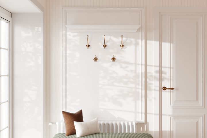 На фотографии можно увидеть панель с крючками, которая является удобным и практичным решением для хранения вещей в прихожей. Она позволяет организовать пространство, удобно разместить верхнюю одежду, сумки и другие аксессуары. Благодаря своей функциональности и стильному дизайну, панель с крючками не только помогает поддерживать порядок, но и украшает интерьер.