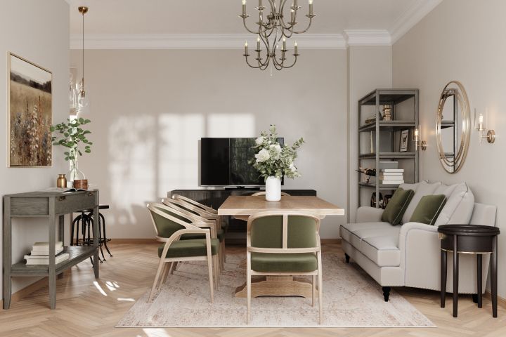На фотографии представлен дизайн угловой кухни в частном доме. Кухня совмещена со столовой, в которой стоит большой кухонный стол. У стола расположен диван — отличное место для отдыха и общения. Рядом находится тумба с телевизором, что позволяет наслаждаться просмотром любимых фильмов и программ во время приёма пищи. Лёгкая витрина добавляет интерьеру изысканности и позволяет удобно разместить различные предметы декора. Этот дизайн сочетает в себе функциональность и уют, создавая идеальное пространство для семейных ужинов и дружеских посиделок.