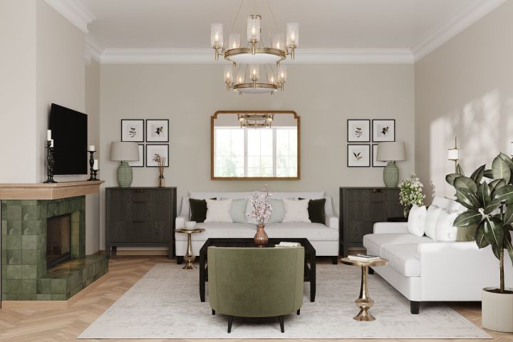 На фотографии представлена уютная гостиная, в которой центральное место занимает портал для камина — идеальное место для создания тёплой и душевной атмосферы. Рядом расположен буфет, внизу которого спрятаны коммуникации, что позволяет поддерживать порядок и чистоту в помещении. Большие диваны и кресло создают комфортное пространство для отдыха и общения, делая гостиную идеальным местом для семейных вечеров и дружеских встреч.