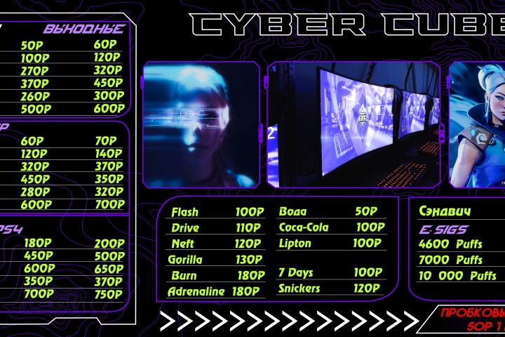 Запрос был таким: Сделать меню, соответствующее компьютерному клубу и его целевой аудитории. Текст должен быть читабельным, чтобы глаз не блуждал по всему меню, ценник и часы должны быть видны сразу.