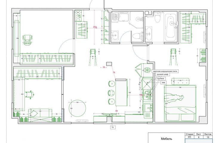 Было решено разместить в квартире два санузла. Основная задача состояла в том, чтобы разместить оба санузла и кухню вокруг системы водоотведения (это важно, так как диаметр фановой трубы от унитаза составляет 110 мм). Для этого было рассмотрено более пяти вариантов планировки. После фиксации расположения санузлов на плане на остальной площади выделили место для кухни-гостиной, спальни, кабинета и ещё одной спальни. Границы каждого помещения корректировались до тех пор, пока не было найдено эргономичное расположение мебели. Затем, с учётом расположения мебели, были размещены розетки и освещение. Вся мебель была разработана с учётом особенностей помещения, то есть бетонных пилонов и двутавров, чтобы скрыть выпирающие части конструкции дома.