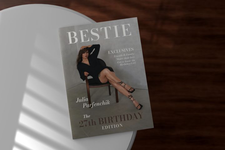Журнал состоит из 44 страниц: обложки с использованием фото именинницы, её натальной карты, звёздной карты (в соответствии с датой её рождения), фотокарточки за период 2015-2025 гг., интервью с друзьями и семьёй (+ видеопоздравления, вшитые в кьюар коды), страница для личных записей именинницы и трогательная речь от главного поздравителя на финальной странице.