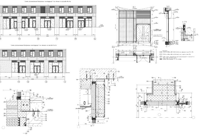Альбом КМ по витражам 1-го этажа. Выполнены схемы фасадов, схемы конструкций, узлы.