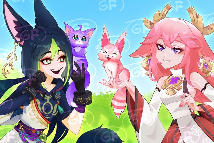 Изображение любимых персонажей клиента в женских образах с животными-талисманами. Нужно было повторить стиль игры немного изменив детали.