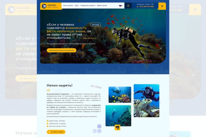 Получился очень яркий, динамичный сайт с контрастными синими и жёлтыми цветами, с яркими подводными фотографиями.