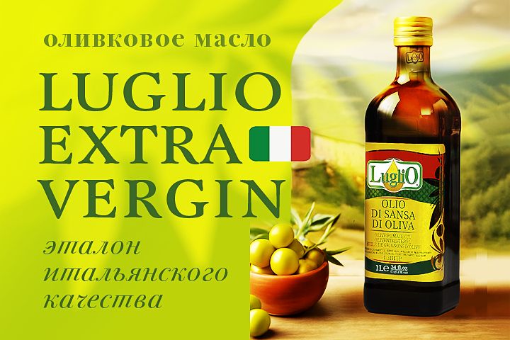 Разработан рекламный макет для продвижения итальянского оливкового масла бренда Luglio. Дизайн выполнен с акцентом на премиальность продукта, его натуральное происхождение и адаптацию под русскоязычную аудиторию. Макет предназначен для использования на маркетплейсах, в социальных сетях, email-рассылках и веб-рекламе.