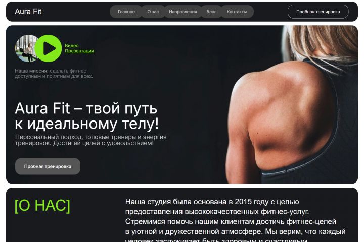 Фитнес-студия Aura Fit хотела создать простой и удобный сайт, который бы представлял их услуги, тренеров и информацию о ценах. Целью было привлечение новых клиентов и облегчение записи на тренировки.