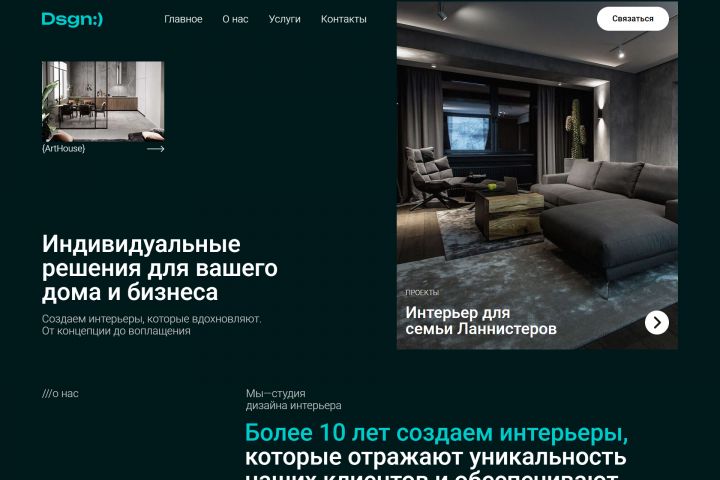 Клиент — студия дизайна интерьера, специализирующаяся на индивидуальных решениях для жилых и коммерческих пространств. Основная задача — создать сайт, который покажет профессиональный подход, опыт работы более 10 лет и разнообразие реализованных проектов. Важно было донести ценности студии: ориентация на клиента, функциональность и стиль.