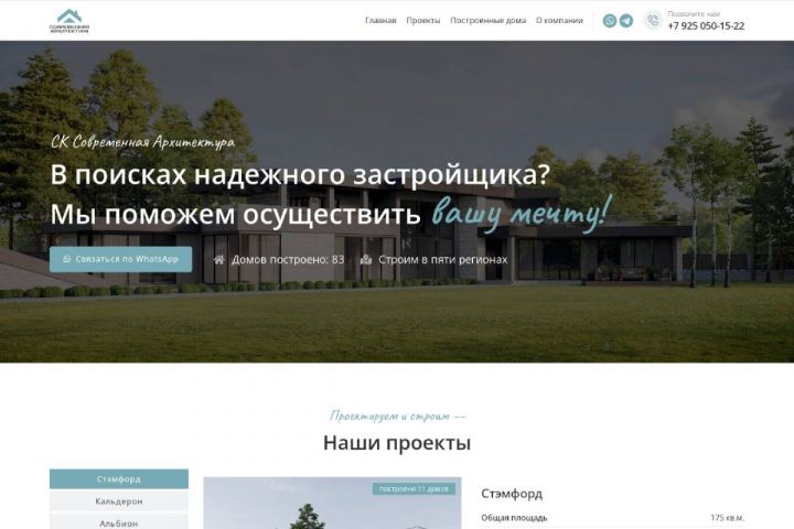 На главной странице есть все необходимые данные о компании, присутствует мини карта с построенными домами, где можно удобно посмотреть все дома, сделанные данной компанией.