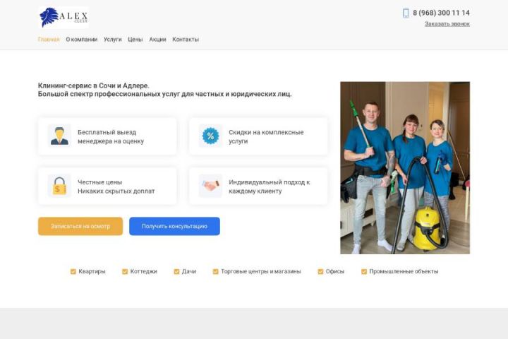 Этот сайт клининговых услуг был разработан с применением цветов, олицетворяющих чистоту - белый и голубой. Применены и использованы фотографии работников этой компании.