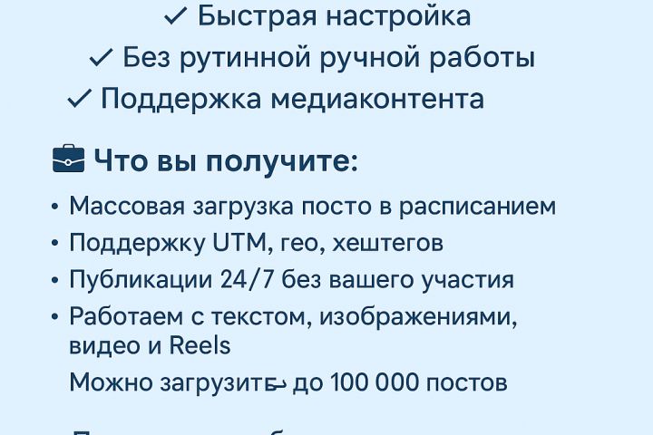 Разработан график публикаций, оформлены шаблоны постов, добавлены UTM-метки для отслеживания. Проведена тестовая неделя с ежедневным автопостингом без участия администратора.