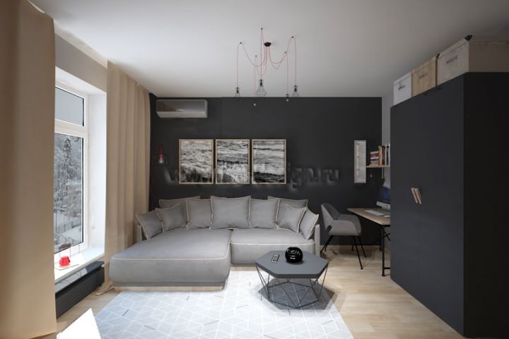 Дизайн интерьера гостиной площадью 16 кв.м в современном стиле. Подробнее о проекте - https://hti-design.ru/projects/interier-gostinoy-spalni-i-lodgiyi/.