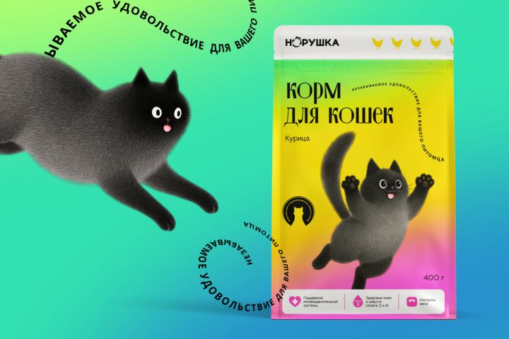 Разработать упаковку для линейки сухого корма для кошек под брендом «Норушка». Упаковка должна быть цепляющей, запоминающейся и вызывать интерес у покупателей.