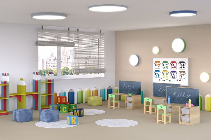 Детский сад. Игровое, обеденное пространство, зона для обучения.