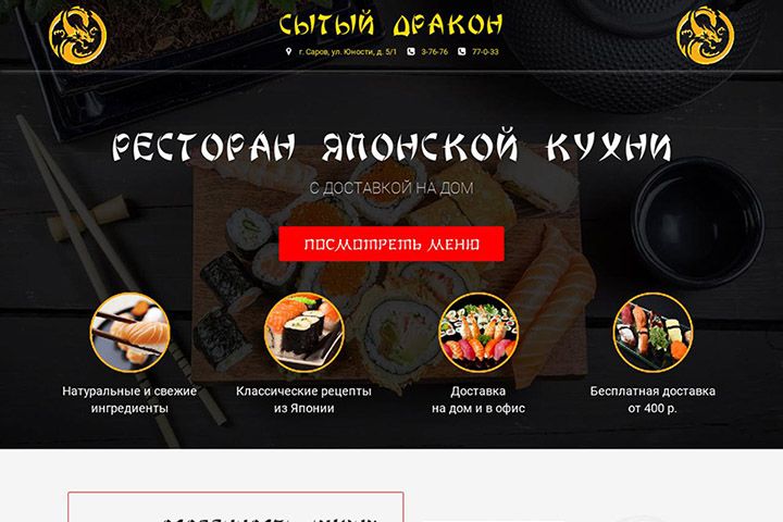 Лендинг сделан в японском стиле, применены соответствующие шрифты, картинки с японской тематикой. Очень яркий, контрастный сайт - жёлтый и чёрный цвета всегда хорошо сочетаются. Красные кнопки и вставки тоже тут подошли и неплохо смотрятся.