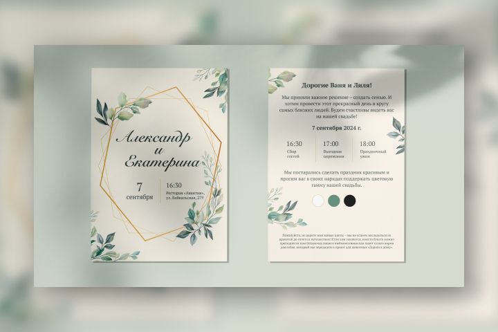 Разработана полиграфия для свадьбы: свадебное приглашение, рассадка для гостей, карточки для гостей и т.д.