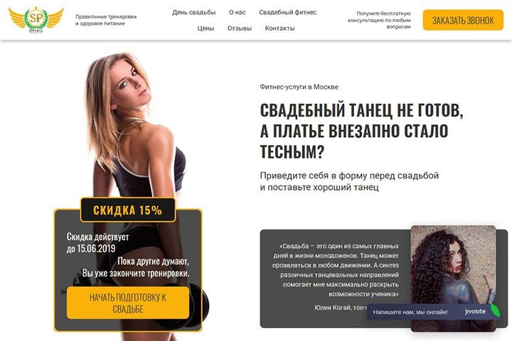 Блоки с информацией очень разнообразны: это уникальное торговое предложение на первом экране, список услуг, захватывающие внимание офферы, преимущества компании, истории клиентов, мастера фитнес подготовки, цены, отзывы и так далее.