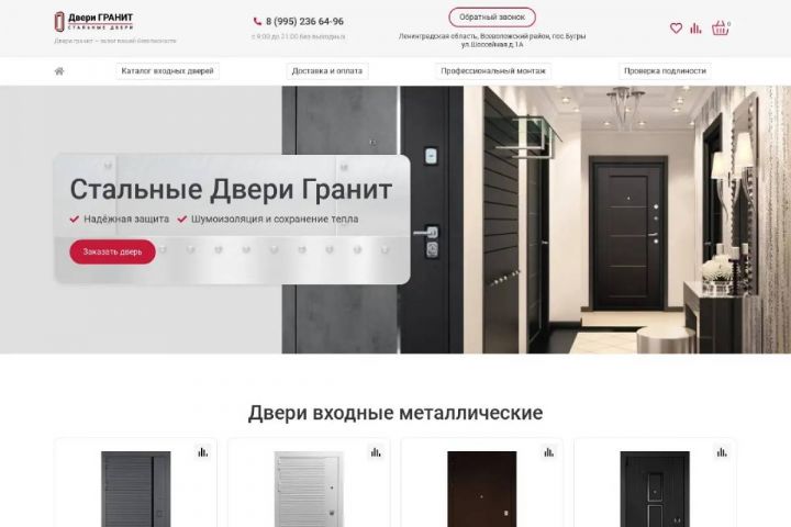 Сайт реализован как полноценный интернет магазин без онлайн оплаты. Но есть корзина, оформление товара. После оформления приходит заявка на почту о желании приобрести конкретную модель двери.