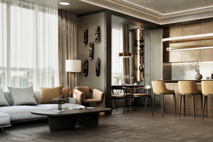 Глубоко индивидуальный стиль с проработкой каждой детали. Сугубо уникальные элементы интерьера, преобладающее большинство элементов в котором, при реализации выполнено на заказ. Действительно, неповторимый стиль.